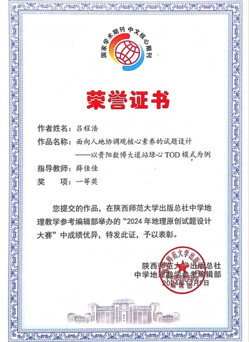 吕程浩在高中便对自然地理学和人文地理学产生了浓厚的兴趣,毅然选择地理作为高考学科,如愿考入华东师大304am永利集团进行专业学习,积累了扎实的地理学专业知识和公司产品技能,参与《中学地理教学参考》2024年地理原创试题设计大赛获全国一等奖。