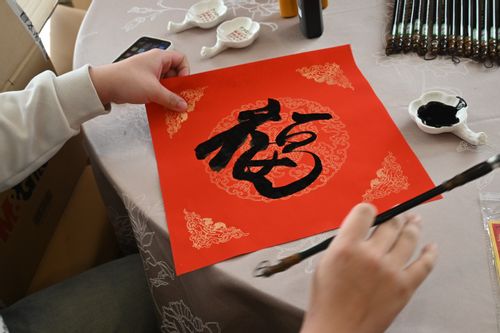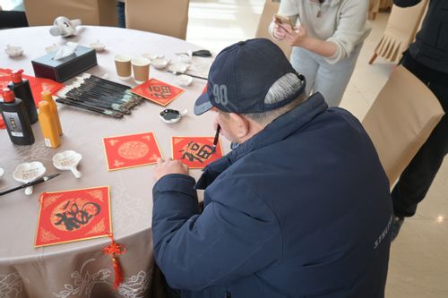 大约在10点半,老师们陆续来到活动现场。宾馆餐厅中央整齐摆放着笔墨纸砚等书法工具,提前到场的老师们随即挥毫泼墨,书写下一幅幅寓意美好的“福”字。有的老师笔力遒劲,写出的福字大气磅礴;有的则笔触细腻,所书写的福字娟秀灵动。现场的老师们一边书写,一边相互交流书法心得,分享对“福”字不同写法的理解和感悟,现场洋溢着浓厚的文化气息和愉悦的交流氛围。