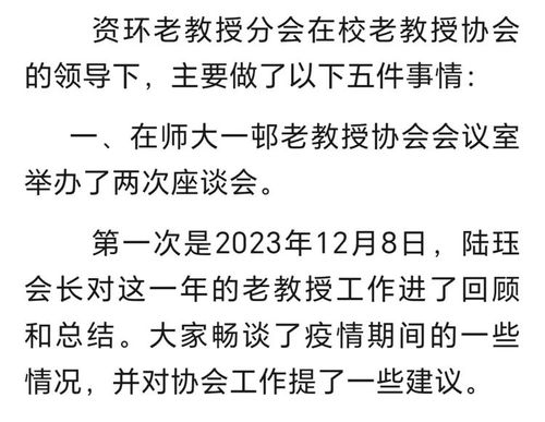 一、资环分会陆珏会长主持了会议,并作了2024年度的工作小结。 陆老师还表示,2025年还要积极参加市、校老教授协会组织的各项活动,希望二附中的医务届员工再来给老教授们开展医疗咨询活动等。 二、黄致中传达了华东师大老教授协会于2024年12月14日举行的工作汇报及2025年的工作设想。 华东师大老教授协会会长杜公卓主持了会议。 华东师大老教授协会秘书长钱品石作2024年工作汇报及2025年工作设想。 出席会议的有各院系的老教授协会分会的30多位老师。 最后祝资环分会的老教授们蛇年快乐,身体健康,阖家幸福,心想事成!