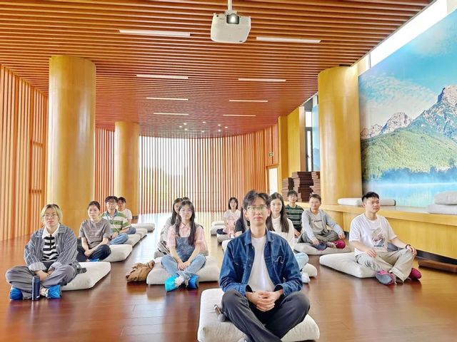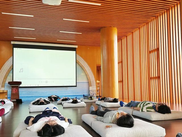 在学校心理健康教育与咨询中心专职咨询师叶子宁老师的带领下,学院师生来到了位于老员工活动中心B区3楼的幸福研习中心。在宽敞宁静的冥想室,“沉浸式”学习冥想的技巧和方法,体会自身情绪,有效释放压力。