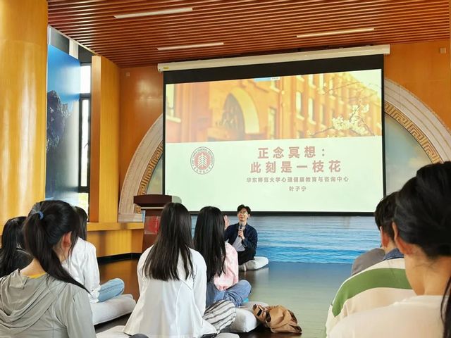 首先,叶老师向同学们介绍了正念冥想的发展历史和正念治疗的理论基础。正念冥想在减轻压力、减少负面情绪、提高学习和工作效率等方面效果显著。接下来的冥想体验中,叶老师带领同学开展身体扫描练习,在舒缓的音乐中放松身心,感受内心的平静与愉悦。