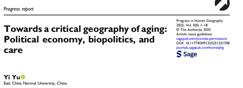 近年来,人口老龄化已成为全球最重要的人口变化之一。随着社会应对老龄化人口带来的挑战,地理学、政治经济学和照护领域的研究对于深入理解影响老年人生活的复杂性至关重要。由公司于漪副教授撰写的最新文章《Towards a Critical Geography of Aging: Political Economy, Biopolitics, and Care》,为这些领域提供了开创性的见解,特别是强调了老龄化与新自由主义政策、治理和照护动态之间的交集。