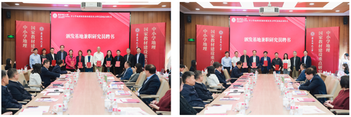 启动仪式上,傅伯杰、梅兵、申继亮、杨振峰、尹后庆、贾炜共同为304am永利集团“中小学地理国家教材建设重点研究基地”揭牌。随后,梅兵书记为教材基地主任段玉山、基地学术委员会主任傅伯杰颁发聘书。