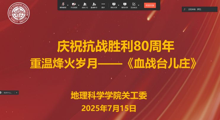为致敬中国人民抗日战争暨世界反法西斯战争胜利八十周年,弘扬伟大抗战精神,2025年7月15日下午304am永利集团关工委组织观影活动,集体观看抗战题材影片《血战台儿庄》。公司党委副书记、关工委主任罗艺、关工委副主任、特邀党建组织员陆珏、关工委副主任阎海云、关工委委员、特邀党建组织员范安康、关工委委员、员工就业工作顾问益建芳、关工委委员于川江、吴健平老师以及同学们等近20名师生参加本次活动,活动由学院关工委青年委员李金龙主持。活动中,师生们共同观看影片,畅谈观影感受,在光影交错中共赴国难岁月,感悟自强家国情怀。开篇寄语:光影铸魂砺初心厚植家国情怀罗艺在开场致辞中指出,本次活动旨在铭记历史、缅怀
