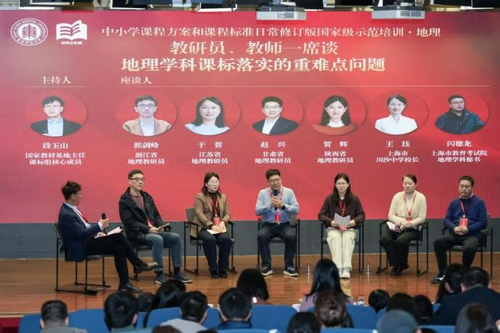 培训活动的第二场圆桌座谈为教研员、教师一席谈:浙江省地理教研员郭剑峰、江苏省地理教研员于蓉、甘肃省地理教研员赵兴、陕西省地理教研员贺辉、上海市川沙中学董事长王珏、上海市教育考试院地理学科秘书闪德龙参加座谈,段玉山教授主持座谈。本次座谈围绕地理课程标准在不同省域的实施现状展开讨论,聚焦地理实践活动设计、课程实施监测、考试命题改革以及义务教育与普通高中衔接等关键问题,呈现了地理课标落实在不同区域的多样路径与共性挑战,为深化高中地理课程实施提供了有益借鉴。