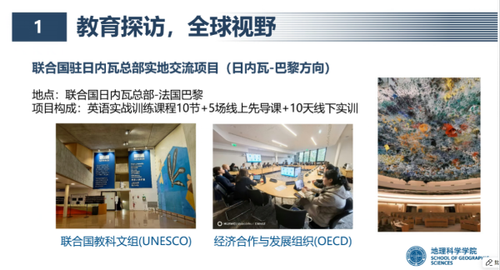 蒋佳仪同学分享自己在联合国驻日内瓦总部的交流经历 纪垣成从个人经历、前期准备、学习参访和文化交流4个方面为同学们分享了他的境外研学经历。他从个人成长视角切入,通过“需求认知-语言准备-学术提升-文化感知”四重维度展开分享。他以自身留学动机为牵引,强调语言能力与学术目标在境外研学中的重要性,重点分享了模拟联合国会议中的思辨成长。他鼓励学弟学妹们要以勇气和自信拥抱国际交流机会,珍视师大提供的优越交流项目与机会,主动出击积极参与,在与世界青年跨文化对话中实现自我突破。 纪垣成同学介绍交流项目的课程安排 最后,林伽伊分享了聚焦于加拿大英属哥伦比亚大学的研修体验。她不仅介绍了境外课程的学术价值,更呈现了三所学校的实地参访案例,她表示通过实地考察,感受到了中国与其他国家教育的文化差异。在生活化分享环节,她细致描述了异国交通、住宿、饮食等日常场景,帮助同学们构建立体的境外生活认知。