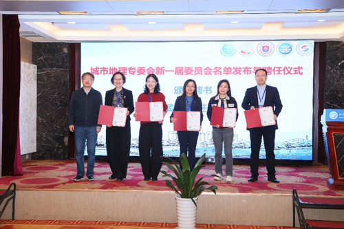 在新一届委员会聘任仪式上,中国地理学会执行秘书长王岱宣读了《中国地理学会关于城市地理专业委员会换届的批复》,中国地理学会副理事长熊巨华向第七届城市地理专业委员会主任委员孙斌栋颁发了聘书。孙斌栋在发言中强调,新一届专委会将坚持学术导向,深化国际学术合作,积极拥抱人工智能与大数据技术,加快促进学科创新的成果转化。他提出,未来将重点打造“城市地理研究”公众号、中国城市地理学大讲堂,并加快启动《新城市地理学研究丛书》的编撰组织工作。随后,孙斌栋向新一届专委会的副主任委员、秘书长、委员等颁发聘书,并合影留念。