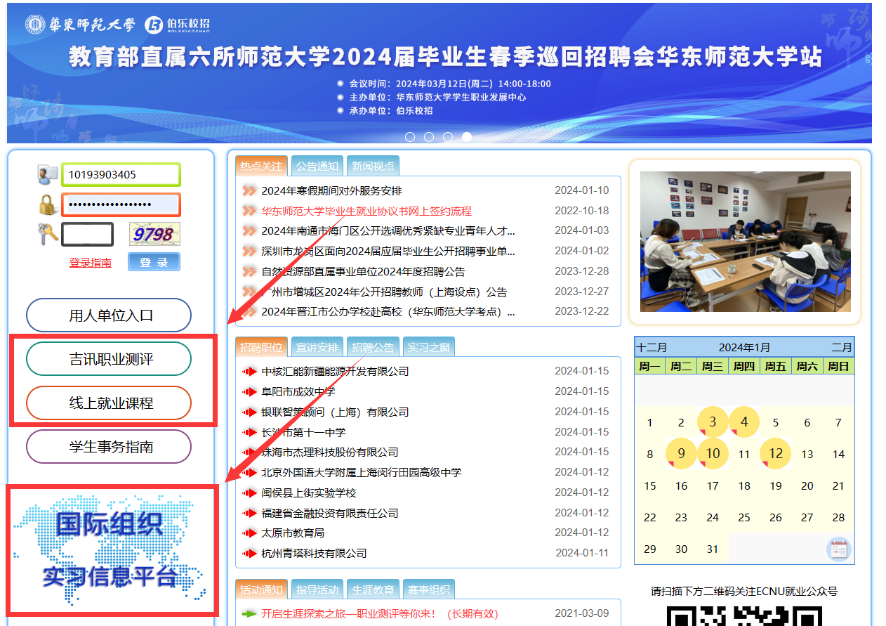 打开304am永利集团员工职业发展中心网址https://career.ecnu.edu.cn/common/index.aspx,点击页面左侧相应栏目(“吉讯职业测评”、“线上就业课程”、“国际组织实习信息平台”)