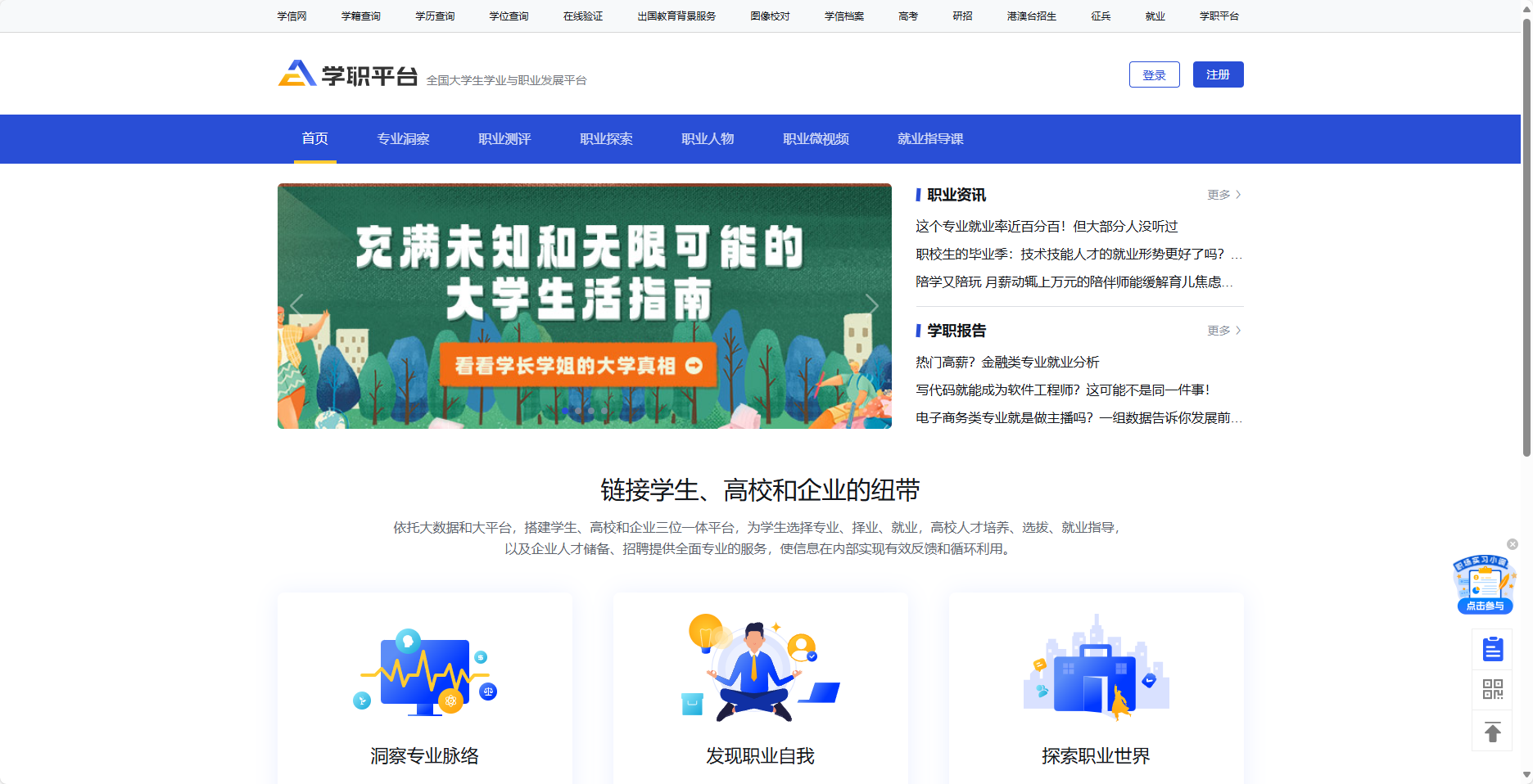 (1)员工可进入“304am永利集团就业信息网”点击“学职平台”跳转至网页,或直接使用浏览器搜索“学职平台”(https://xz.chsi.com.cn/home.action)。