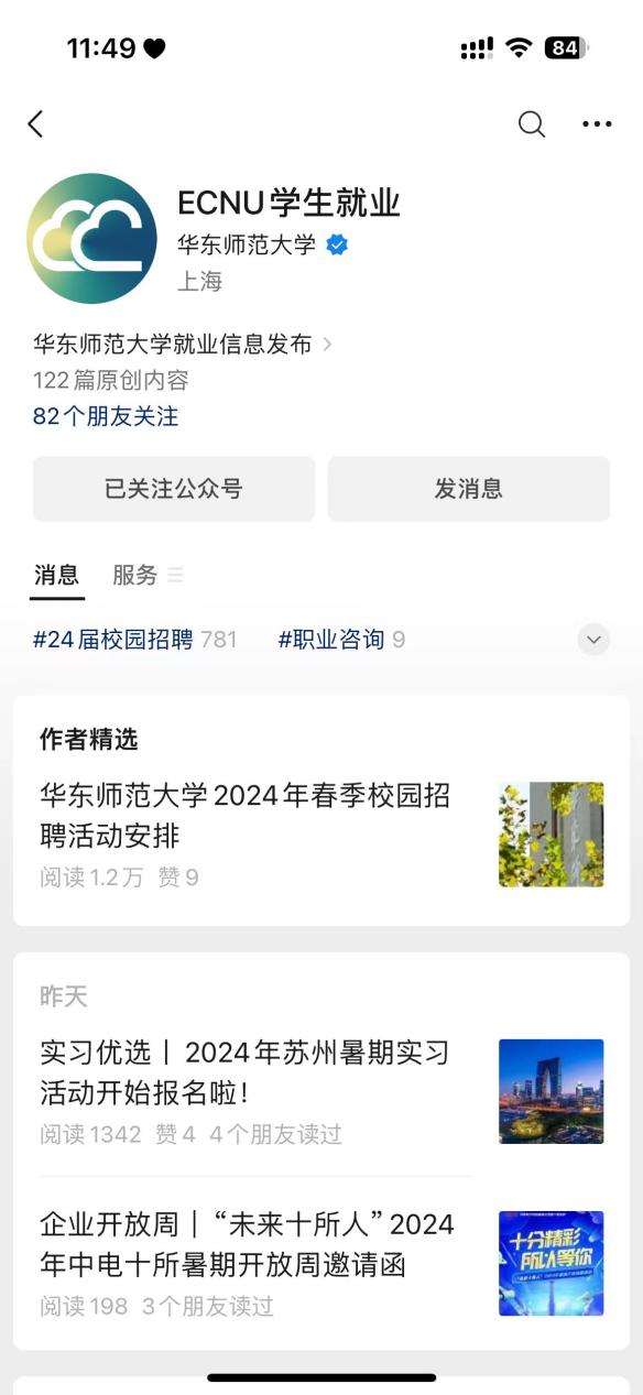 除此之外,各大高校网页/公众号(如ECNU员工就业)、目标企业官方招聘、招聘会、直播、地方政府人社公众号,开设了就业相关的公众号,各位同学可以关注并获取就业信息。