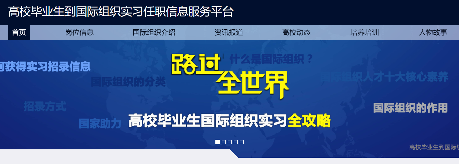 “高校毕业生到国际组织实习任职信息服务平台”,内设岗位信息、国际组织介绍、资讯报道、高校动态、培养培训、人物故事等六个栏目,具备信息交互检索功能。目前,该平台收集整理了近200家国际组织情况介绍,并实时跟踪采集联合国教科文、世界卫生组织、国际货币基金组织等数十家国际组织招聘信息。
