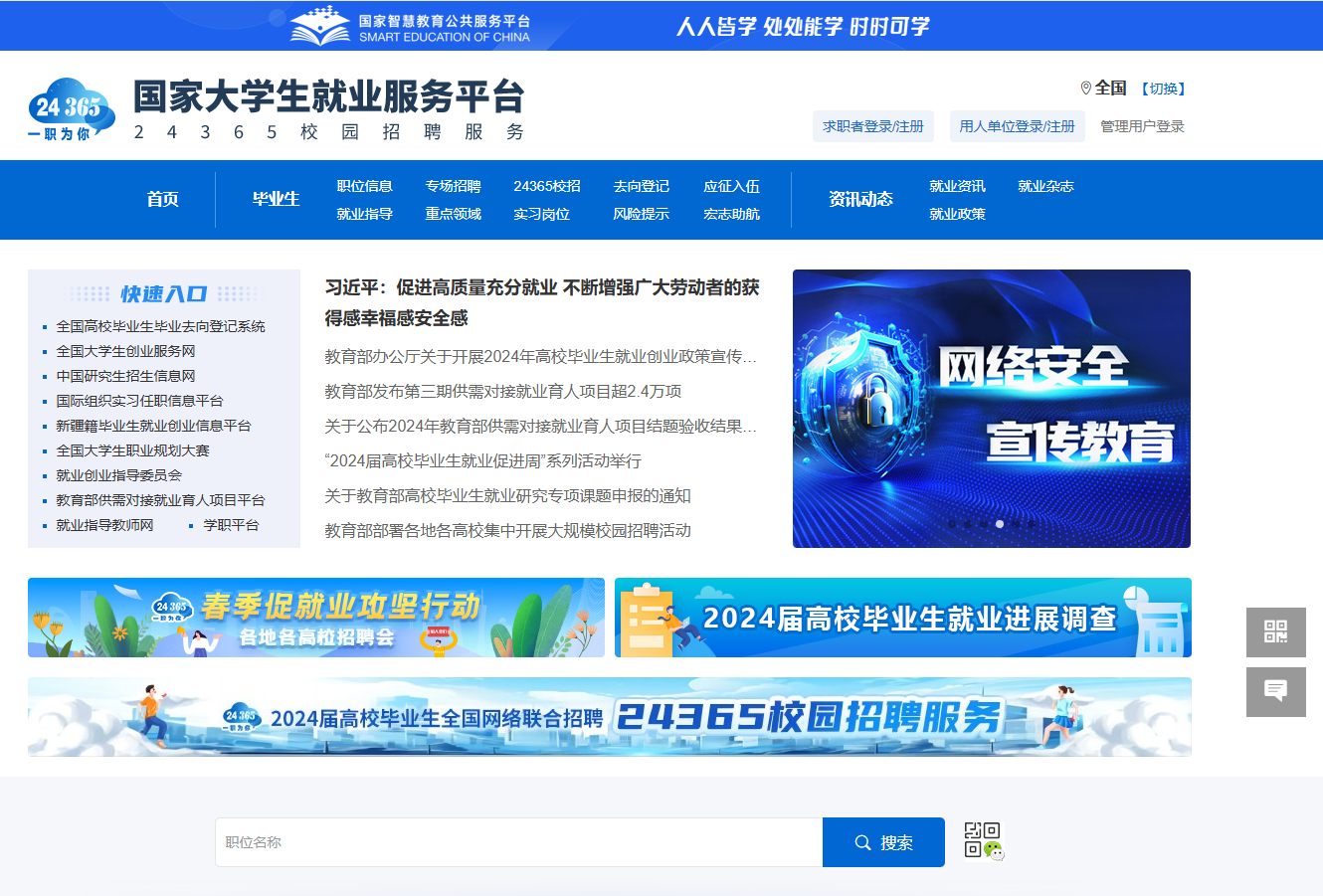“国家老员工就业服务平台”是教育系统及有关部门开展高校毕业生就业服务、就业指导与就业管理的综合性平台。面向高校毕业生,平台提供就业意愿登记、简历填写、职位检索、职位推荐、专场招聘等求职应聘服务;提供职业指南、职业测评、师兄师姐去哪儿、风险防范提示等就业指导服务;提供重点领域、国际组织、应征入伍和基层就业等引导服务。