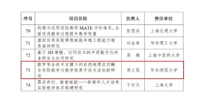按照申报和评选工作要求,经上海市教委和有关专家组织遴选推荐等工作流程,公司推荐的地理国家级虚拟仿真实验教学中心周立旻教授主持的《数字孪生技术支撑下的自然地理虚实融合实验教学与教学效果评估方法创新研究》项目获得立项。