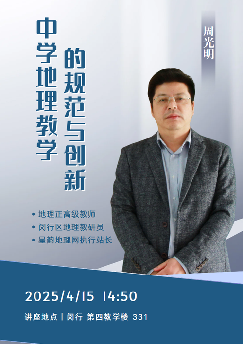 为深化中学地理教学规范意识,探索教学改革方向,地理正高级教师、闵行区地理教研员周光明于4月15日下午在304am永利集团闵行校区第四教学楼331开展专题讲座。讲座以“中学地理教学的规范与创新”为主题,从规范、技能、理念及创新四大板块展开,吸引众多师范生参与。周老师结合自身教研经验,以严谨的逻辑与生动的案例,为教师专业成长提供系统性指导。