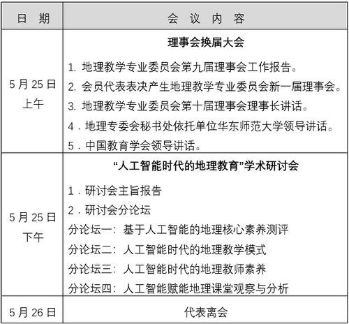 为深入贯彻党的二十大和二十届二中、三中全会精神,落实全国教育大会精神,实施《教育强国建设规划纲要(2024-2035年)》,探索中学地理课程教学改革的新路径,推进人工智能时代的地理教育高质量发展,中国教育学会地理教学专业委员会定于2025年5月24至26日在上海召开“中国教育学会地理教学专业委员会第十届理事会成立大会暨‘人工智能时代的地理教育’学术研讨会”。现将有关事宜通知如下: