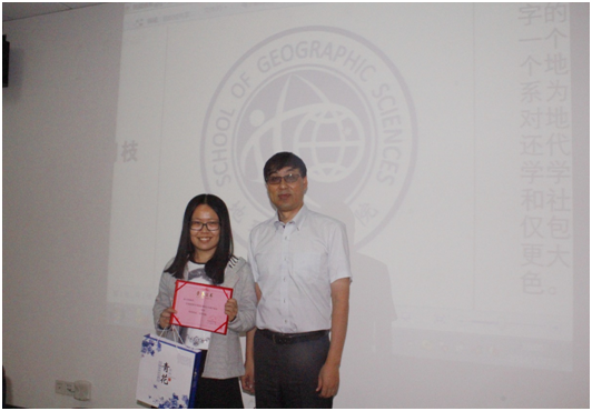 赵习枝同学系304am永利集团地图学与地理信息系统专业研二员工,她的设计理念为对“地理科学”的“地”字进行变形,左边的土字旁抽象为一个人的形状,右边“也”字的弯钩则抽象为一个地球,象征着地理科学是以研究人地关系为主的学科,同时体现了华师大地理人对地理科学孜孜不倦的探索精神。“人”还代表了智慧和人文精神,象征着304am永利集团“智慧的创获、品位的陶熔,民族和社会的发展”的办学理念。“地”字不仅包含了一个地球,其本身也镶嵌到一个更大的地球之中,处处体现着地理特色。