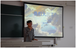 随后,围绕“我们大三了!——把握大三,规划未来”这个主题,同学们展开了热烈的讨论,聂霄磊和靳文同学作为代表上台发言,总结了自己大一、大二两学年的学习和生活,并就大三的学习和生活计划进行了展望和介绍,也提出了自己面临的一些困惑和难题,与大家分享了自己的理想和对未来的规划。