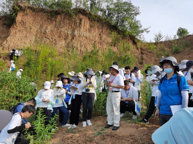 接着我们来到了梨花村酒厂对面的黄土剖面(32°50’7″N,110°44’48″E)进行考察。,该处黄土由棕黄色泥质粉砂构成,粒径细,含有大量钙质结核,孔隙度高,垂直节理极为发育。可以观察到古土壤层和灰色黄土层,碰巧的是,我们看到有研究者再次取样后留下的痕迹,让我们了解到了黄土取样的基本方法。我们还观察到黄土崩塌形成了堆积,随处可见鸡蛋大小的钙质结核。此外,华中农业大学的胡老师给我们讲解了南方黄土母质发育的地带性黄褐土,并就该土壤类型的剖面特征、化学特征和肥力等做了系统讲解。强调土壤肥力是水、肥、气和热的综合体现,其中肥是指养分多少及其关系,不能简单把肥力和肥划等号。