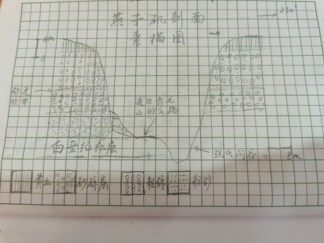首先,我们来到了汉江第四阶地所在地之一的燕子崖(32°48’32″N,110°43’32“E)。在现场,李长安教授向我们展示如何绘制该处剖面图和汉江河流阶地剖面示意图,详细讲解了画示意图的步骤,并让我们自行观察剖面特征和绘制示意图,精进了专业技能。