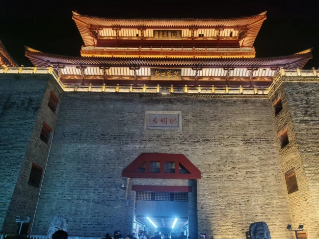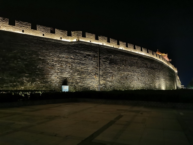 晚20:30,实习队伍前往襄阳古城(32.025°N,112.142°E),考察了襄阳古城的城墙和护城河,了解了城墙外砖内夯土的构造及城池的历史沿袭。襄阳古城南跨汉沔,北接京洛,地处要冲,是历代兵家必争之地。襄阳城东、南、西三面修建的全国最宽的护城河和其北的汉江天堑,使其易守难攻,因此号称“华夏第一城池”。