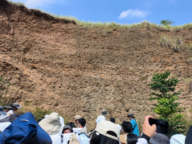 接着我们来到了梨花村酒厂对面的黄土剖面(32°50’7″N,110°44’48″E)进行考察。,该处黄土由棕黄色泥质粉砂构成,粒径细,含有大量钙质结核,孔隙度高,垂直节理极为发育。可以观察到古土壤层和灰色黄土层,碰巧的是,我们看到有研究者再次取样后留下的痕迹,让我们了解到了黄土取样的基本方法。我们还观察到黄土崩塌形成了堆积,随处可见鸡蛋大小的钙质结核。此外,华中农业大学的胡老师给我们讲解了南方黄土母质发育的地带性黄褐土,并就该土壤类型的剖面特征、化学特征和肥力等做了系统讲解。强调土壤肥力是水、肥、气和热的综合体现,其中肥是指养分多少及其关系,不能简单把肥力和肥划等号。