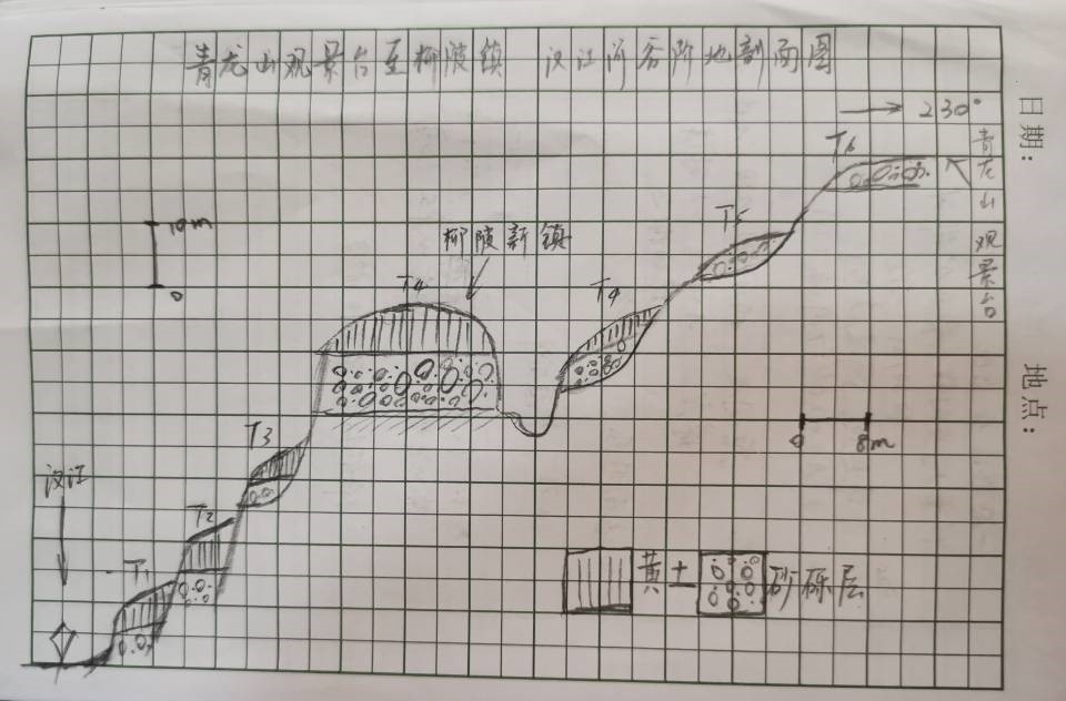 首先,我们来到了汉江第四阶地所在地之一的燕子崖(32°48’32″N,110°43’32“E)。在现场,李长安教授向我们展示如何绘制该处剖面图和汉江河流阶地剖面示意图,详细讲解了画示意图的步骤,并让我们自行观察剖面特征和绘制示意图,精进了专业技能。