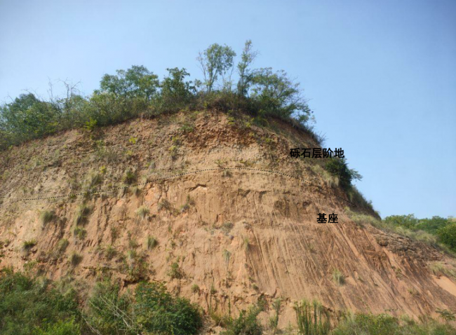汉江郧阳段流域的地形多为沟谷,河谷宽广,河流阶地较为发育,阶面宽阔,可见到5级阶地:T1阶地在发育较好,但在峡谷地段多缺失,且丹江库区二期蓄水后基本被淹没;T2阶地分布较广泛、阶地面较平坦;T3~T5 阶地面一般侵蚀破坏严重,多遭受冲沟强烈切割,地貌上多为残丘,地层残缺不全。通过李长安教授的讲授,我们了解到该处砾石层为汉江T4阶地,属于基座阶地,阶地上部有黄土堆积。T4阶地海拔180~200m,基座由白垩系褐红色砂岩、砾岩构成,通过观察阶地剖面砾石层中砾石大小不一,通过测量较大砾石长轴a可达34cm,中轴b为13cm,短轴c为9cm ,大多砾石5-12cm,且层叠瓦状排列。还发现有粉砂透镜体厚度约30cm,长度不等。
