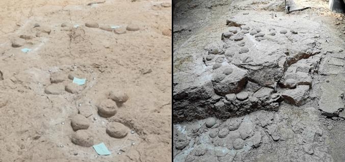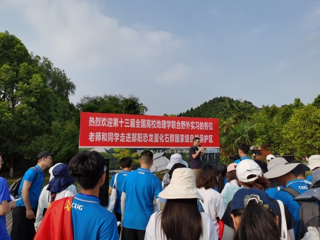 2022年8月2日上午8:30,实习队伍来到郧阳恐龙蛋化石群国家地质公园(32°48’46’’ N, 110°43’23’’ E)进行实习。该地质公园位于十堰市郧阳区柳陂镇青龙山,面积约10平方公里,是国内外已知的面积最大且保护最为完好的恐龙蛋化石群所在地。埋藏的恐龙蛋化石形成于65 Ma B.P. ~ 96 Ma B.P.,具有分布集中,数量大、密度高,种类多,埋藏浅、产出层位多(6层),保存完好和埋藏地层剖面完整等特点,具有极高的典型性、稀有性、科学价值和保护与利用价值。