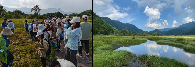 从板壁岩驱车约1小时,实习队伍来到了大九湖湿地(31.4709°N,110.0272°E),该湿地海拔约1750m,分布于山间盆地。我们是首先参观了大九湖湿地馆。了解到大九湖湿地是典型的泥炭藓沼泽,由于海拔较高,年均温为7.4℃,年均降水1530mm,这样的气候有利于泥炭形成,该湿地对涵养水源、改善气候、蓄水防洪、调节径流、维护区域生态平衡等方面起到了重要作用。大九湖的成因有多种说法,其一是断陷盆地发育而形成湿地。李长安老师根据地下发育的暗河和地上的山丘分布,初步判断可能是岩溶作用形成了大九湖,他鼓励同学们以后有机会进一步探究大九湖成因。