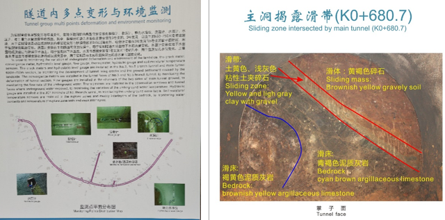 图4 黄土坡试验隧洞群监测示意图(左)掌子面滑动带(右)