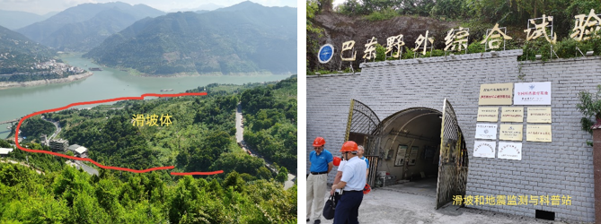 8月6日上午9:00,实习队伍来到巴东野外综合试验场(31°2′35.27″N,110°22′54.95″E)考察滑坡研究与监测。该试验场选址三峡库区体积最大、危害性最严重的滑坡——黄土坡滑坡区域,通过隧洞群系统对滑坡体开展原位试验和深部监测。长江三峡是典型的河流V形峡谷地貌,地质灾害滑坡、岩崩、泥石流等时有发生。三峡库区的建设与运行对地质灾害产生了一定的影响。水库水位的上升与周期性的水位变化会改变库区原有的地质环境平衡状态,带来滑坡、岩崩、泥石流、地裂缝、地面沉降等地质灾害。