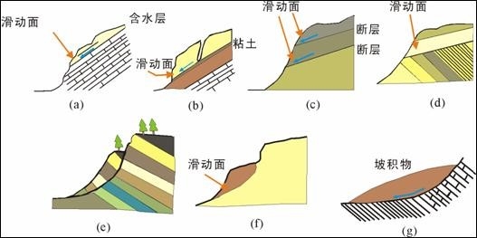图2滑坡滑动面与地质构造关系示意图 (a)含水底板;(b)粘土层;(c)断裂和节理面;(d)不整合面;(e) 风化裂隙与节理;(f)黄土节理;(g)残、坡积层底部