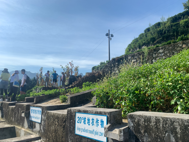 8月7日上午,联合实习队伍首先来到张家冲小流域(30°46′58.22″N,110°54′52.37″E)进行考察。张家冲小流域位于秭归县茅坪镇西南部,为典型的闭合小流域,在出口设有量水堰,以观测流域的径流量。本流域位于黄陵穹窿,属典型的花岗岩出露且受强烈风化作用发育的区域,土壤为花岗岩母质风化发育的石英砂土,透水透气性强,水土流失较为严重。为探索水土流失规律,本区设立了水土保持试验站,通过建立不同坡度(5°、8°、15°、20°和25°)、不同作物(花生、柑桔和茶叶)、耕地类型(坡耕地、土坎梯田、石坎梯田)和有无植物篱(紫穗槐)的小试验区,观测坡面径流的泥沙含量和作物的投入产出效益等。