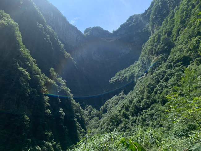 随后,实习队伍来到三峡竹海(30°44′47.18″N,110°54′52.37″E)考察泗溪峡谷地貌。该处地层主要为寒武系灰岩,强烈的溶蚀作用形成地下暗河和天坑,天坑群顶部塌陷使地下暗河出露。实习途中可以观察到两岸的弧形崖壁,指示了此处峡谷地貌的成因是天坑塌陷。