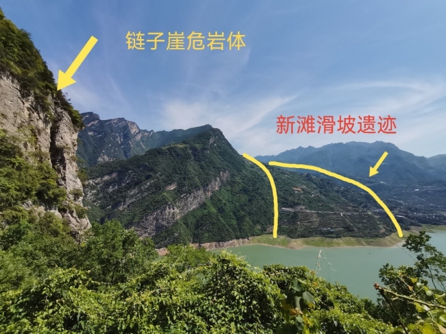 新滩滑坡遗迹位于链子崖危岩体长江对岸(北岸),下距三峡大坝27km,三峡大坝修建前新滩是长江航道上著名的急流险滩,这是因为该处多次古滑坡发生,导致岩体滑入长江,因而滩多水急。新滩滑坡经历了长时间的变形,于 1985年6月12日凌晨3点,发生了特大型滑坡。滑坡摧毁了位于其前缘的新滩古镇,由于监测预报及时,撒离组织得力,滑坡区内居民千余人无一伤亡,但是滑坡激起的巨浪,向上下游传播,造成船毁人亡,10名人员死亡。
