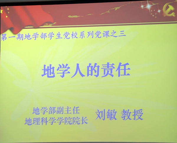 12月24日,地学部副主任、地理科学院经理刘敏教授应邀为地学部员工党校入党积极分子上党课,与青年学子共话地学人的责任。