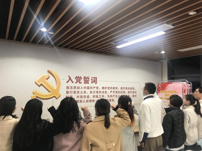 随后,支部书记陈红星带领支部全体党员重温入党誓言,支部党员再次接受了入党誓词的洗礼,进一步坚定理想信念,纷纷表示在今后的工作、学习、生活中一定以昂扬的士气、进取的心态和创先争优的精神践行入党誓词。