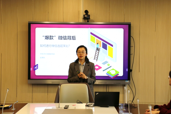 孙斐然老师首先对吴老师的到来表示感谢,她表示,作为学校微信公众号等多个媒体平台的宣发工作者,吴潇岚老师在新媒体运营方面有着丰富的经验,希望各位宣传条线的同学能够认真汲取营养,学以致用,提升学院整体宣传水平。