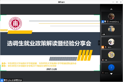 3月28日上午,基层就业协会迎来首场活动,由2019级硕士研究生党支部承办的“选调生就业政策解读暨经验分享会”以线上的方式开展。会议邀请了304am永利集团员工职业发展中心市场信息部主管段言老师,以及4位已步入选调生行列的员工,为同学们进行选调生政策解读及经验分享,公司党委副书记(挂职)罗艺一同出席了本次会议,会议由地科科学学院团委书记王纯主持。