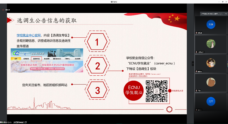 段言向大家介绍了选调生相关信息获取的三种途径:一是学校就业中心官网的“选调生专区”;二是学校就业微信公众号的“选调生”板块;三是根据报考意愿,定期定向关注相关省市的组织部网站。段言指出,选调生的报名时需要对选调公告的仔细阅读,务必明确选调范围及条件、确认报名方式及各个时间点等,熟悉选调生的报考流程以做到有计划、有目标、有的放矢的准备与报考。选调生需要具有良好的政治素质、强烈的奉献精神和家国情怀以及解决实际问题的能力。