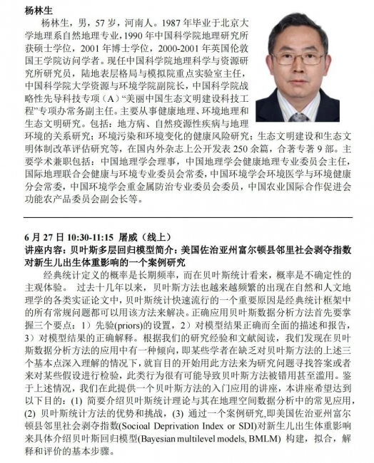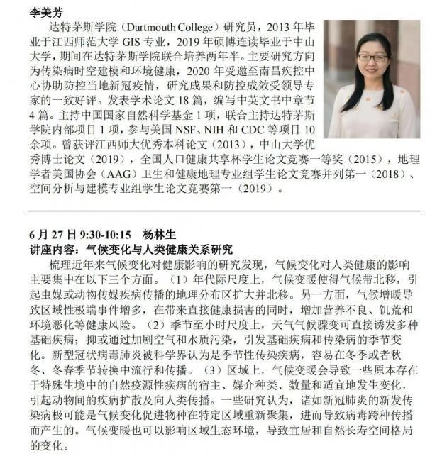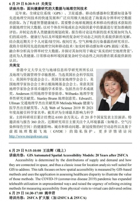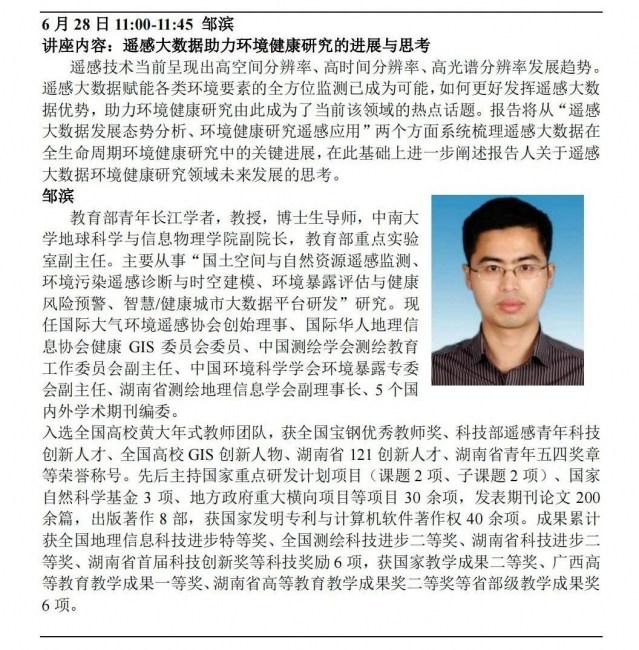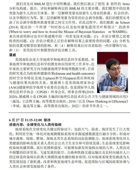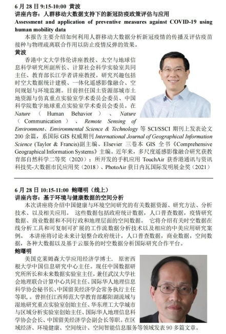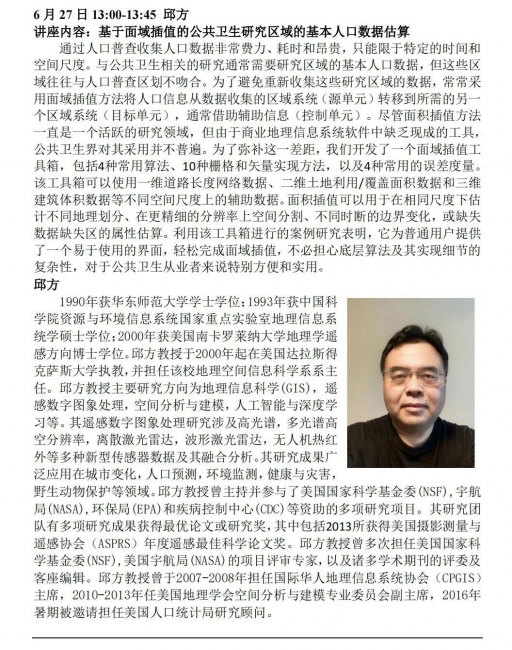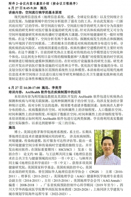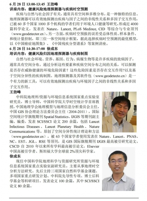 将邀请知名学者介绍地理信息科学与技术在流行病学、环境健康、医疗服务资源配置等领域的应用。主讲学者包括(以下按姓氏笔画排列):