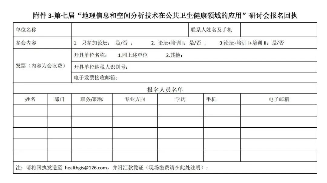 请有意参加者,通过电子邮件将“报名回执”发送到Email: healthgis@126.com(见附件3)。报名表亦可通过链接:https://pan.baidu.com/s/1UKJmcWoQRhMS_52ya6cm4w(提取码: 2023)下载。