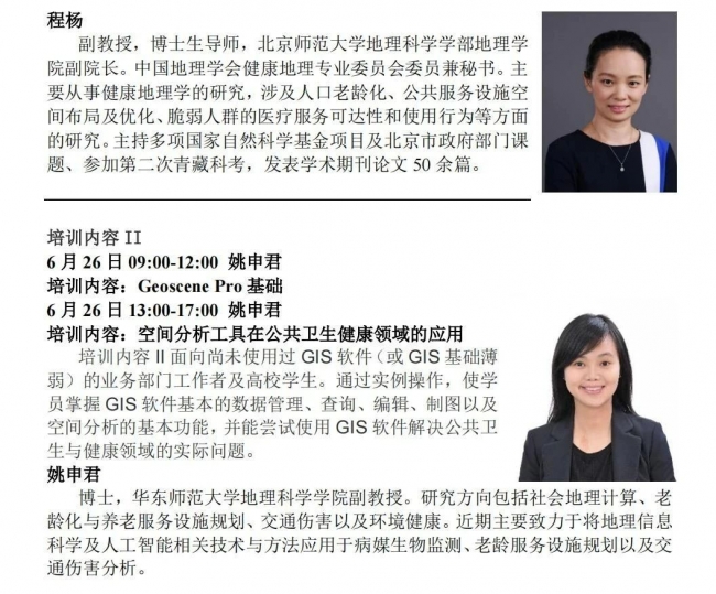 培训I:健康GIS专业软件培训,包括ArcHealth软件包在疾病制图中的应用、健康风险归因地理探测器与疾病制图、2SFCA扩大版(加i2SFCA & 2SVCA)。