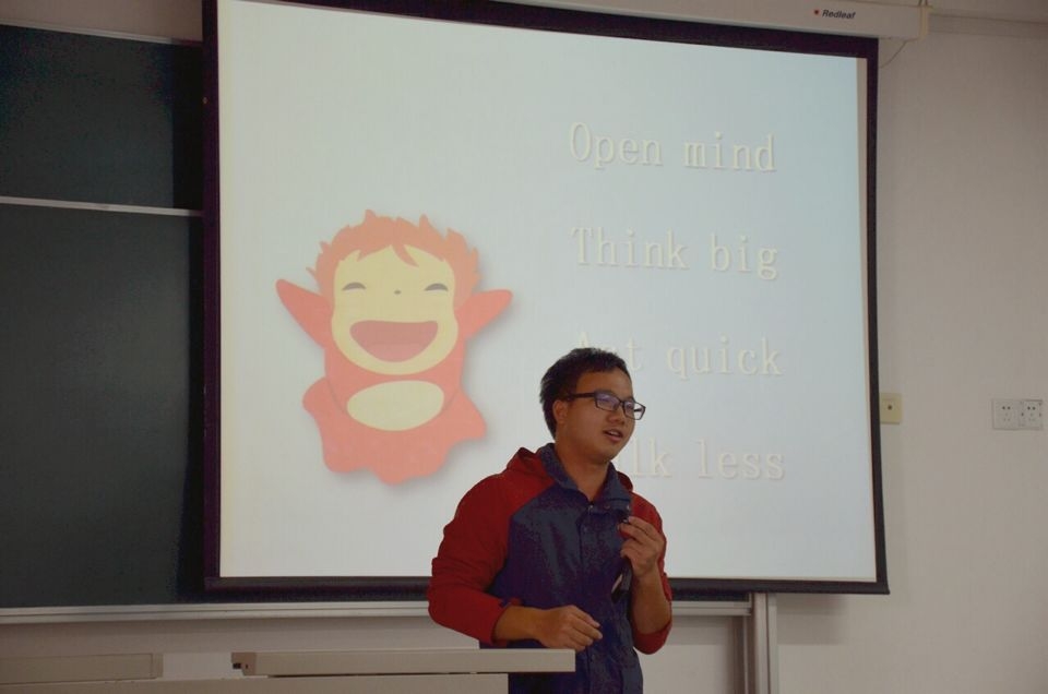 大四年级的邓顺强,刚刚获得免试直升资格,并被公司录取。他向学弟学妹们介绍了自己对老员工活的感悟与经验,鼓励我们要做一个“有想法”的人,他说“每个人都要走自己的路,要努力为自己创造更多的可能”、“open mind,think big,act quick,talk less”。