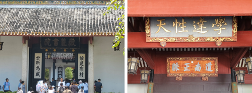 7月29日下午13:00,实习队伍来到了岳麓书院。岳麓书院坐落于长沙的岳麓山脚下,是我国古代著名的四大书院之一,具有深厚的文化底蕴和悠久历史。何峰老师介绍了岳麓书院的历史沿革、布局特点及文化传承,让同学们深切认识到岳麓书院不仅是我国古代教育的象征,更是儒家理学文化的传承和发扬的典范。通过考察书院内保存完好的古建筑群落和幽爽宜人的学习环境,同学们认识到书院选址的地理原因,对古人教育与自然和谐共生的智慧有了深刻理解。