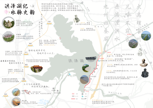 新中国成立后,在人民政府高度重视下,淮河得到有计划、有步骤的系统治理。在淮安市境内,先后兴建了苏北灌溉总渠、三河闸,整修加固了洪泽湖大堤,开辟了分淮入沂和淮河入江水道以及淮河入海水道等,使淮河下游的出路有了很大改善,结束了“洪水横流、岁岁为患”的历史。江河湖海在这里互联互通、互济互调,淮安水利枢纽被誉为“江淮中流”要地。通过实地考察淮运水上立交、苏北灌溉总渠、高良涧和三河闸使得同学们更进一步了解淮安水利枢纽如何实现兼具泄洪、灌溉、调水、排涝、航运、发电等综合功能(图23-26)。同学们以洪泽湖为主题,完成了实习洪泽湖“水脉史韵”创意地图绘制(图27)