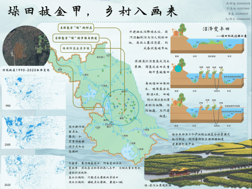 江苏省里下河地区地势低洼,而兴化地区又是里下河地区的“锅底洼”。洼地水多地少,湖荡纵横,历来饱受洪涝侵害,部分农田不得不以垛田的方式维持种植(图28)。本次考察使得同学们了解垛田作为一种以当地生态环境的变迁为背景,以防治洪涝为目的,适应人口快速增长的独特的土地利用方式。垛田这种古老的农耕方式使用自然肥料,如罱泥、扒渣、搅水草等,形成了人与自然和谐发展的垛田农耕体系(图29,30)。垛田是研究该地区乃至更大区域范围地理、历史、人文的一个重要标本和活化石。同学们完成了垛田时空变迁及形成过程分析总结(图31、32)