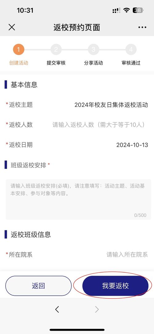 2.班级联络人点击“我要返校”,填写返校集体的相关信息,提交信息,等待后台审核。