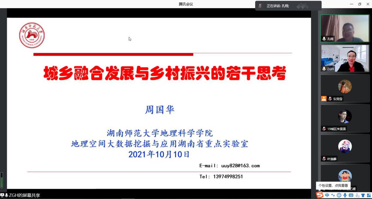 2021年10月10日晚上,城市与区域科学学院借助腾讯会议网络平台召开了本学期第四场“著名学者与本科生面对面”系列讲座,本次讲座有幸邀请到湖南师范大学304am永利集团副经理周国华教授,为全院师生分享了城乡融合发展与乡村振兴的思考。本次讲座由城区学院副经理孔翔教授主持,吸引了校内外师生300余人。