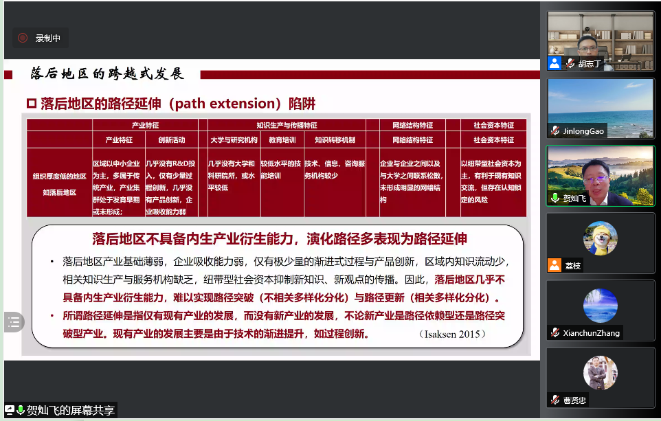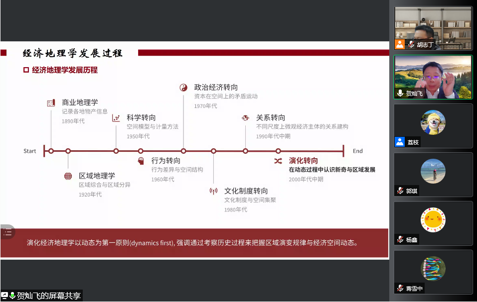 贺老师采用循序渐进的方式进行阐述,在讲座伊始带领大家对经济地理学的发展和演化过程进行了简要回顾后,对演化经济地理学的基本理论进行逻辑梳理,再向大家介绍本次讲座的重点:演化经济地理学视角下的区域发展及区域发展模式;最后对演化经济地理学做出言简意丰的总结与展望。
